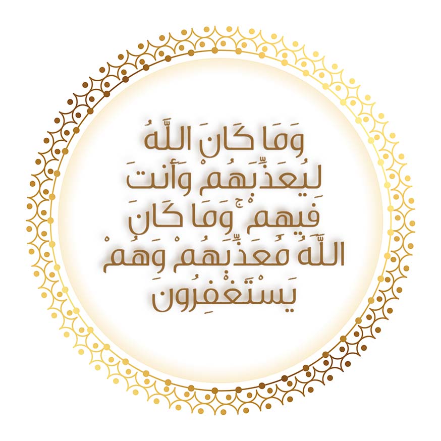 وَمَا كَانَ اللَّهُ لِيُعَذِّبَهُمْ وَأَنتَ فِيهِمْ ۚ وَمَا كَانَ اللَّهُ مُعَذِّبَهُمْ وَهُمْ يَسْتَغْفِرُونَ